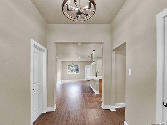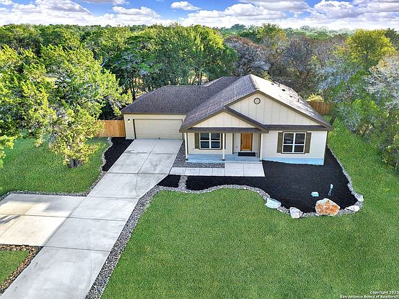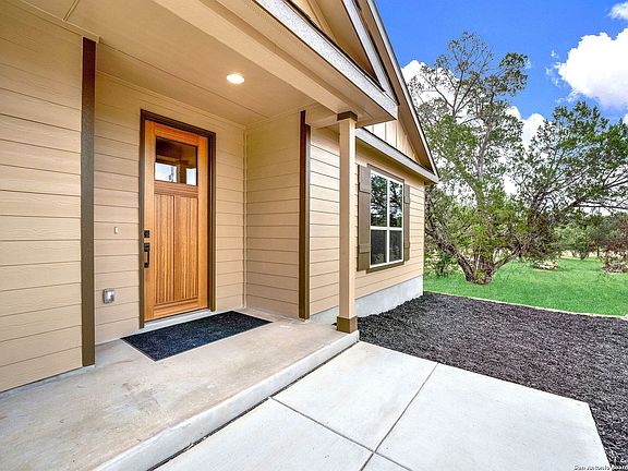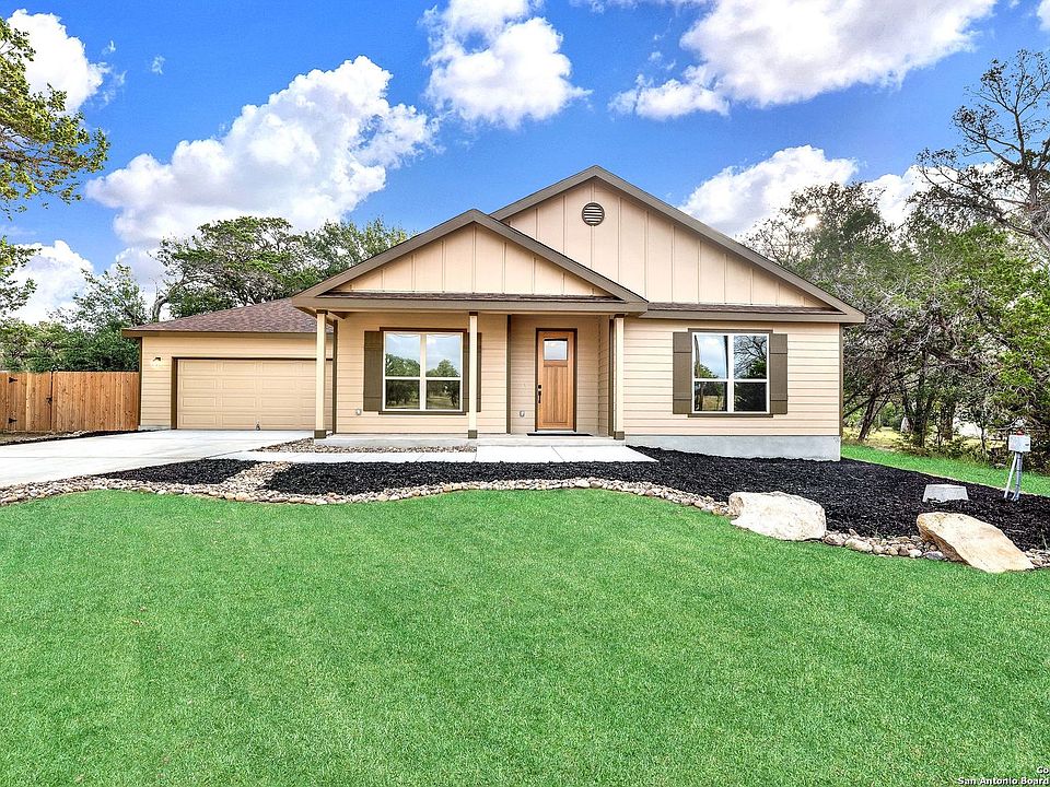 OPEN HOUSE AUG 12th 12-2pm Welcome to 3133 English Crossing, an exquisite house crafted by MasterPeace Homes, nestled in the picturesque town of Bandera, Texas- "Cowboy Capital of the World". This stunning property offers the serenity of a 1-acre lot adorned with a myriad of mature trees and a fully-fenced back yard. The stunning backyard retreat, coupled with rare Medina river access through two peaceful community parks, creates a true oasis of tranquility and provides direct access to Mother Nature in all her glory. Step inside to discover a beautifully designed interior that exudes modern elegance. This spacious abode boasts an oversized entryway, 3 bedrooms, 2.5 bathrooms, and a large utility room, providing ample space for comfortable living and entertaining guests who love the quiet country escape and impressive live music scene of Bandera. The thoughtfully crafted layout spans 1,908 square feet, offering an open and airy feel that is accentuated by large windows, allowing for abundant natural light to fill the space. The heart of the home showcases a gorgeous kitchen with a wonderfully extended bar with sleek quartz countertops, natural maple cabinets, and stainless steel appliances. Whether you're preparing a delicious meal or gathering around the island for casual conversation, this kitchen beckons family and friends to gather around. The living spaces are designed to offer the right blend of coziness and style, featuring high-end finishes and the perfect ambiance for spending quality time with loved ones or unwinding after a long day. The attached, two-car garage ensures ample space for your vehicles and storage needs, making daily life effortless and convenient. Whether soaking in the beautiful views off the covered front porch, enjoying the solitude of the gorgeous backyard, spending the afternoon fishing, kayaking, or hiking along the cool, bubbling river, this home offers it all. This meticulously crafted, new construction residence by MasterPeace Homes offers a rare opportunity to experience the best of Bandera, Texas living. Located just 30 min from San Antonio, Kerrville, or Boerne, you get the best of both worlds. Don't miss your chance to make 3133 English Crossing your forever home. Schedule a viewing today and let this extraordinary property capture your heart!