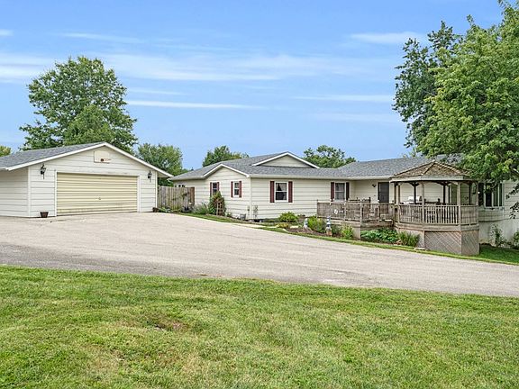 This expansive ranch home offers over 2,600 sq ft of living space on the main level and is set on a sprawling 10-acre property, divided into two 5-acre parcels. One parcel includes a separate driveway and an old barn-like structure, while the other hosts the house, an oversized 2-car garage (24x24), and a 3-car garage (24x32). The home features 3 bedrooms and 2 bathrooms, with two large bedrooms sharing a bath. The master suite is in its own wing, boasting an enormous master bedroom, a luxurious master bath, and a spacious walk-in closet. The main floor also includes a generous laundry room, a substantial living room, and an oversized, vaulted kitchen with all appliances included. Additionally, the unfinished walkout basement is ready for your personal touches. Outside, you'll love the charming gazebo attached to the front deck, perfect for enjoying the serene surroundings.