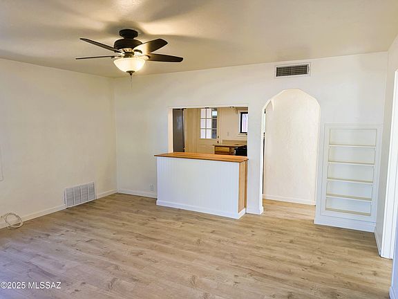 Beautifully updated 1940s home with new wood laminate flooring, fresh paint, modern lighting, upgraded ceiling fans, new electric water heater, new gutters, and a new water line from street to home. Features retro built-ins and a welcoming front porch. Kitchen offers stylish cabinetry, stainless appliances, and Corian countertops. Includes 3 bedrooms, large closets, and a full bath with pedestal sink. 464 square foot enclosed patio serves as laundry and hobby area with nearly completed plumbing for an extra bedroom and bath. Enjoy a large ramada for entertaining plus a 628 square foot art studio/bonus room with wall A/C and workshop overlooking the Santa Catalinas.