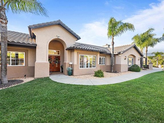 This beautifully upgraded home in a highly desired Michael Crews development of Skyridge Estates, offering craftsmanship, modern upgrades, and plenty of room to entertain, inside and out. The fully remodeled kitchen is a chef’s dream, featuring KitchenAid stainless steel appliances, an induction cooktop, granite countertops, a farmhouse-style stainless sink, and an oversized kitchen island perfect for gathering. A spacious walk-in pantry provides ample storage. The four-car garage offers epoxy flooring and newer insulated garage doors, while the newer exterior paint gives the home fresh curb appeal. Step outside to your private backyard oasis, fully fenced and designed for relaxation and entertainment. A pebble-finish pool with a Shamu step, a Palapa barbecue kitchen with an outdoor TV, and mature queen, Canary, and sago palms that create a lush, tropical feel. The covered patio off the primary bedroom makes for the perfect morning retreat. there is also a flat usable area for RV garage or horse setup. No HOA and close to local high school. This home combines luxury, functionality, and outdoor living — the perfect blend for Valley Center living.