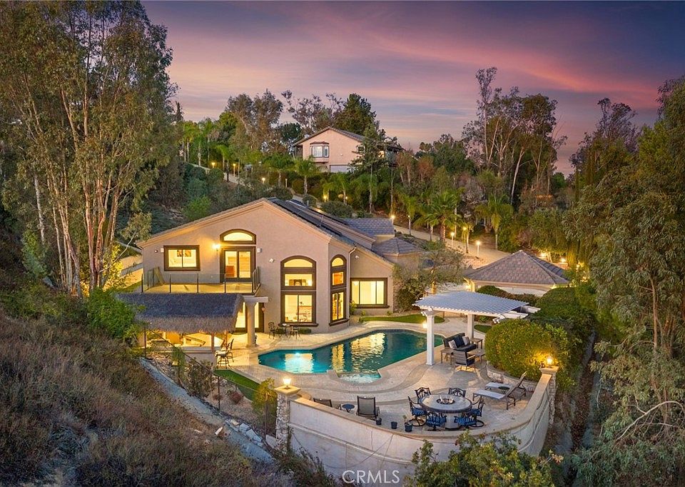 Welcome to your dream home in the highly sought-after Meadowview community—where privacy, elegance, and Southern California charm converge. This stunningly upgraded estate offers 5 spacious bedrooms and 4 beautifully appointed bathrooms, perfectly designed for comfort, functionality, and upscale living. From the moment you arrive, you'll be captivated by the home's refined curb appeal and meticulous attention to detail. Inside, discover an expansive open-concept layout filled with natural light, high-end finishes, and seamless indoor-outdoor flow—ideal for both everyday living and elevated entertaining. The designer kitchen, complete with premium appliances, custom cabinetry flows seamlessly between the dining and family room. A towering great room and multiple living spaces provide the perfect backdrop for gatherings both intimate and grand. Step outside to your private backyard resort—an entertainer’s paradise. Unwind or host under the stars with a sparkling custom pool, incredible outdoor fireplace, and fully equipped bar and BBQ area. Whether you're hosting summer soirées or quiet family evenings, this outdoor retreat is truly unmatched.