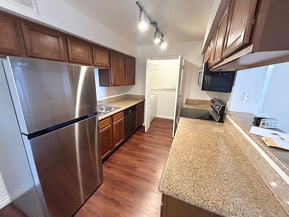 The kitchen and bathrooms feature granite countertops, and the unit comes with stainless steel appliances plus a full-size washer and dryer for added convenience. A private balcony with stamped concrete provides a perfect spot to relax.