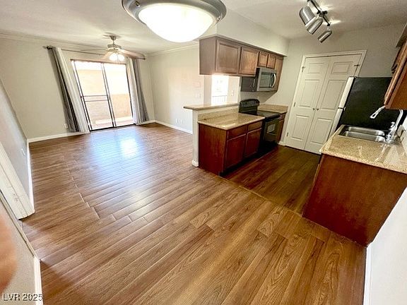 Nicely renovated 1 bed, 1 bath, 2nd floor condo with private balcony. Gated community with community pool, spa, and fitness center. Laminate wood floor throughout for easy maintenance. No dirty carpet to worry about. The bedroom is extra large. Stainless steel appliances, granite countertops, washer and dryer in the unit, window draperies, ceiling fan and balcony with extra storage closet. All appliances included. Assigned covered parking. Tenant pays for electric and $38/month for sewer/trash services. Close proximity to UNLV, Las Vegas Strip, & airport.