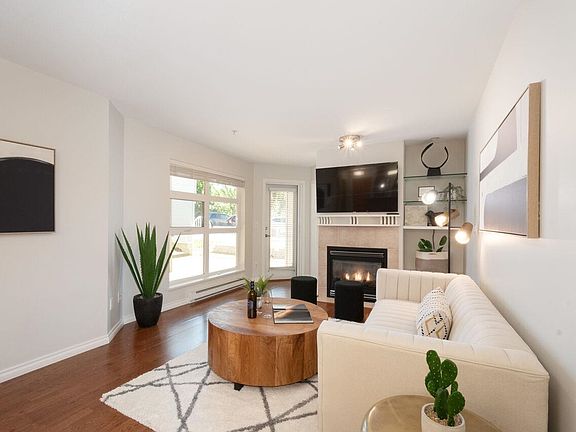 This TWO BEDROOM + DEN (EASILY 3RD BEDROOM) ground-level home offers nearly 1,100 sq. ft. of open-concept living with a rare separate street entry and does not face St. John’s. The spacious den is ideal as a guest room or office. Enjoy 399 sq. ft. of fully fenced outdoor space—perfect for entertaining or relaxing. All rooms, including the large primary with double closets and full ensuite, open directly to the patio. Features include tile and engineered hardwood floors, a gas fireplace, two side-by-side parking stalls, and a large storage locker. Pet-friendly with no size restrictions. Walking distance to SkyTrain, WCE, Rocky Point, Brewers Row, and shops. Immediate possession available!