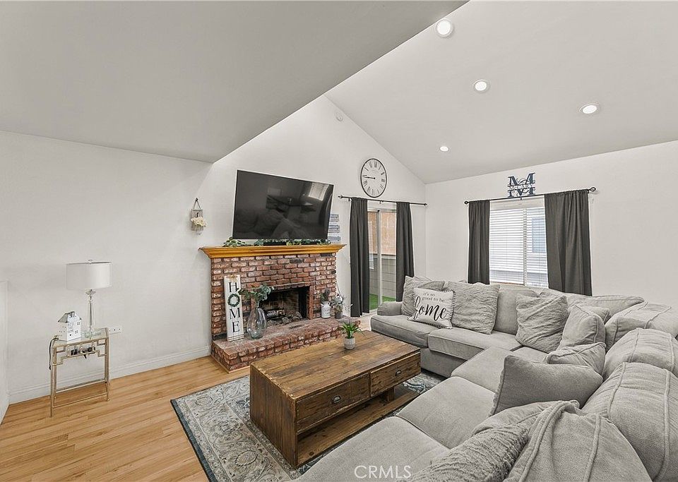 Spacious Upper level 2 bedroom townhome "penthouse" style in the Cimmaron Oaks community of Castaic. This private end-unit townhome does not share any walls with neighbors...and features 2 balconies to enjoy...one off the slider from open living room, and the other balcony off the slider from Primary bedroom. The living room with vaulted ceilings with new LED recessed lighting and plenty of natural light features a brick fireplace and opens to the private balcony and dining room. The kitchen comes equipped with mission-styled cabinets and large pantry. Wood flooring throughout home, a built-in desk area in the hallway with carpet in the bedrooms with ceiling fans and mirrored closet slider doors, and ceramic tile in the bathroom. BRAND NEW HVAC unit will be installed prior to close. The 2-car attached garage currently being used as a “man-cave” has washer/dryer hook-up and wood shelving from ceiling for additional storage.