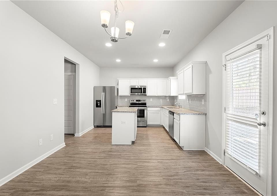 Welcome home!! Prepare to be wowed by its captivating open concept floor plan and modern design. Step inside and immediately notice the spaciousness and attention to detail. The kitchen is a true focal point, featuring granite countertops, a convenient island, stylish white cabinets, and a backsplash that adds a touch of sophistication. All stainless steel appliances, including a refrigerator and washer, are included, ensuring a seamless transition into your new home. The oversized master bedroom offers a luxurious retreat with its own sitting area, perfect for unwinding after a long day. The tiled master bath boasts a tiled shower surround and a large master closet, providing ample storage space for your belongings. Equally impressive, the three secondary bedrooms are generously sized and share another full bath, ensuring comfort for all residents. Custom flooring throughout the first level enhances the home's aesthetic appeal, while plush carpet floors on the upper level add a cozy touch. Outside, you'll find a serene and flat backyard, surrounded by nature, offering a peaceful haven for outdoor activities and relaxation with lawncare included in the rent amount! Convenience is key with the laundry room conveniently located on the second floor, making household chores a breeze. This home offers an abundance of features to love, from its modern design to its functional layout and exquisite finishes. Don't miss this incredible opportunity to make this stunning Decatur home yours. With its combination of comfort, style, and prime location, it won't be on the market for long. Schedule a showing today and prepare to be impressed!