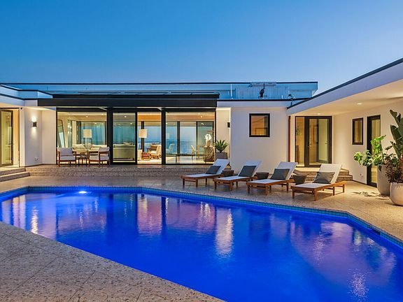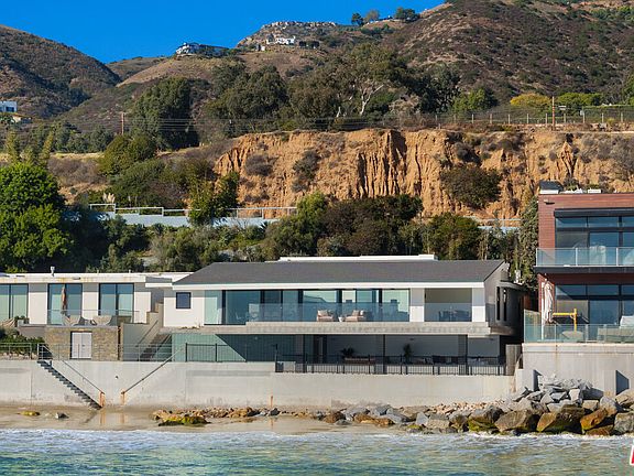 Welcome to a completely remodeled luxury estate where modern elegance meets panoramic ocean views on approximately 80 feet of beach frontage. This exquisite property retains its original configuration but has undergone a 95% renovation to deliver a sophisticated, updated living experience. As you arrive, gated parking welcomes you, along with a driveway that accommodates up to six vehicles, including a two-car garage. The secured entrance features a gated walkway equipped with a camera and intercom, offering both privacy and peace of mind. Steps lead you down from the main road into a serene setting with immediate ocean vistas.Upon entering the home through a large glass front door, you are greeted by an open floor plan designed to embrace natural light, thanks to skylights and floor-to-ceiling windows. The living area boasts limestone tile floors and wood-beamed ceilings with recessed lighting, all set against the stunning backdrop of the Pacific Ocean. Sliding glass doors open to both the oceanfront deck and the pool area, inviting you to enjoy seamless indoor-outdoor living. The dining area, adjacent to the living room, offers metered glass windows with coastline views, flowing naturally into the modern kitchen. The kitchen is a chef's dream, featuring black stone counters, a six-burner Thermador range with BBQ, double convection ovens, and a Gaggenau appliance suite, including a built-in coffee machine, dishwasher, fridge, and freezer. With floating illuminated shelves, a pot line, and a striking green tile backsplash, this kitchen combines functionality with style.Off the living room, a media room awaits, equipped with built-ins, illuminated shelving, a large television, and automatic shades. A glass door opens to the courtyard, where stone-tile floors frame an in-ground pool with ocean views. The courtyard also offers ample seating, including a covered area by the in-ground jacuzzi. For added convenience, the detached laundry room is located on the bottom deck, complete with stone counters, tons of storage, and limestone tile floors. This outdoor space also includes a covered outdoor shower, ideal for rinsing off after a day by the pool or beach.The home's layout offers four bedrooms downstairs and a master suite upstairs. Each bedroom features luxurious finishes, including wood or stone floors, en-suite bathrooms with stone counters, and skylights. One of the bedrooms is designed as an office with ocean views, while another offers automatic lights and custom-built storage. The master suite is accessed via a separate staircase, where a stunning light fixture sets the tone for luxury. With wood floors, views of both the ocean and pool, a walk-in closet with illuminated built-ins, and a state-of-the-art speaker system, the master suite is a private sanctuary. The master bath is equally indulgent, featuring waterfall stone counters, a freestanding tub, a stone shower stall with a steam function, and double shower heads.The home also includes modern amenities like central air conditioning, a full alarm system, and a tankless water heater. The lower deck is the perfect spot to relax and take in the coastline views or watch dolphins play in the surf. With its covered seating area and ample space for lounging, this outdoor oasis provides the perfect setting for unwinding or entertaining.This estate offers an unparalleled blend of luxury, privacy, and breathtaking natural beauty, making it a rare gem on the market. The house pays only 25% of the annual beach assessment, a rare benefit that results in significant yearly savings.