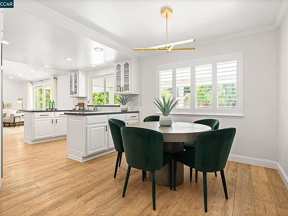 Single-story, 2,010 sq ft, 4-bedroom, 2.5-bath home + 120 sq ft detached studio, located in Walnut Creek’s sought-after Northgate neighborhood. Designer updates & a seamless indoor-outdoor layout make it equally suited for refined entertaining & relaxed everyday living—all centered around a resort-style backyard with sparkling pool & spa. At the center of the home, an updated kitchen with quartz counters, white cabinetry, stainless appliances & casual bar seating is perfectly placed between the inviting family room with vaulted ceilings & fireplace & a sunlit dining area. The living room + dining area impress with shiplap ceilings & large bay window. Spacious primary suite opens directly to the backyard and is complemented by a sleek en-suite bath with a glass-enclosed shower. Three additional bedrooms provide flexibility for guests or family & share a stylish hall bath with bold tilework. A chic powder room & laundry room with built-in storage enhance everyday ease. Step outside to a true backyard sanctuary—complete with a sparkling pool & spa, mature landscaping, shaded lawn & multiple zones for dining and lounging, including a large covered patio. The studio offers a private spot for work or creative pursuits. Minutes to top-rated schools, parks, shopping & dining.
