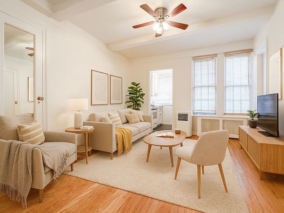 Beautiful apartment with a windowed kitchen and bathroom, AC, hardwood floors, and 2 large closets.
