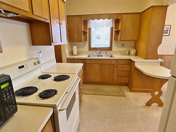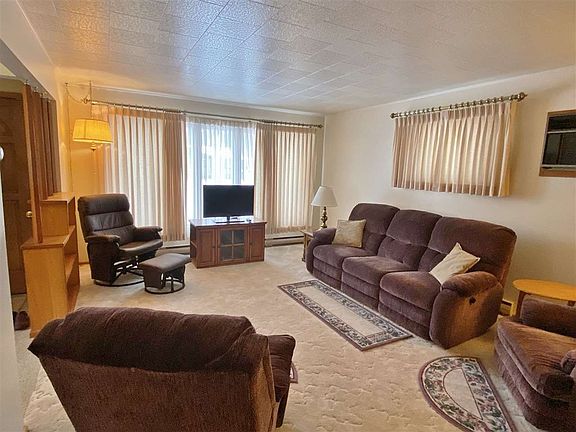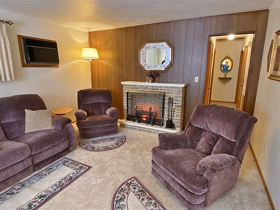 Relax on the front porch! Check out this cozy 2+2 bedroom home with attached garage. Main floor features kitchen with built in hutches, breakfast counter and separate dining area. 2 bedrooms and full bath on main level also. Lower level includes 2 non-egress bedrooms, summer kitchen, 3/4 bath, laundry with W/D and family room. Exterior front porch, attached single garage, concrete patio and shed, and newer driveway. House has electric heat and steel siding. New windows and shingles. Alley access. Walking distance to shopping. Great location!