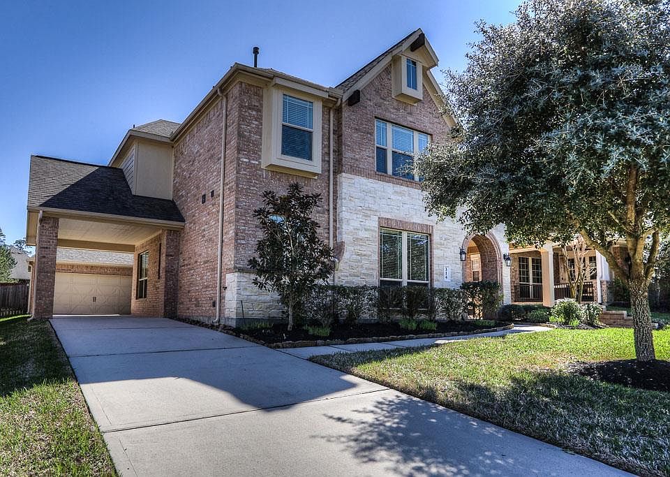 Excellent opportunity for a lightly lived in home in Jacobs Reserve zoned to Woodlands schools, porte-cochere, room sized covered patio & a chef's dream of a kitchen! Double ovens, 7'x4' island & GE Profile SS appliances. Study or formal dining* Wood floors in entry, study and living* Upstairs features a generous game/media room (ceiling speakers stay), one private suite and two additional bedrooms with a hall bath* Speakers also stay in living* Integrated outdoor speaker system on patio*