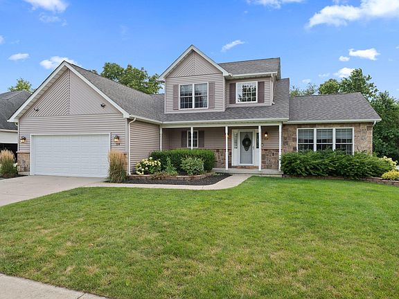 Charming 1.5-story home featuring 3 bedrooms and 3 baths, surrounded by beautiful landscaping and a welcoming covered front porch. Step inside to find hardwood floors and an updated kitchen with modern finishes, stainless steel appliances, and a new refrigerator and dishwasher. The spacious main bedroom offers a walk-in closet with California Closet System and a beautifully remodeled bath, while the upstairs includes two generously sized bedrooms and a full bath. Bedroom 1 has a California Closet System and Bedroom 2 has an organizer system. Hall closet also has California System. The finished basement provides extra living space, perfect for a family room, home office, or gym. Recent updates bring peace of mind with a new furnace, new water heater, whole-house humidifier, new roof, and new garage door. A new washer and dryer in the laundry room with California Closet System are also included. Enjoy your private fenced in backyard oasis, ideal for relaxing or entertaining around the built in firepit. Don't miss your chance to own this move-in-ready home!
