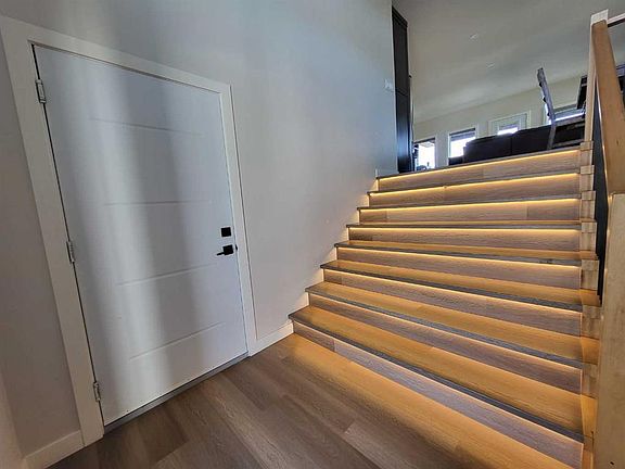Discover exquisite living in the charming community of Nobleford with this custom-built home, offering 1,876 sq ft of luxurious space, featuring 5 bedrooms and 3 bathrooms. Located just a 30-minute drive north of Lethbridge. Nobleford boasts a K-12 school, churches, a couple of restaurants, a convenience store, and a spray park. Plus, enjoy the benefits of low taxes. This property showcases impressive curb appeal with modern finishes, numerous large windows, a grand driveway, and a triple car attached garage accessible from the main entrance. The heated garage is equipped with water hookups and a floor drain, making it an ideal workshop for your projects while still providing ample parking space. Step inside to find the home of your dreams, greeted by grand, wide staircases accentuated with built-in lighting. On the main level, you’ll discover a high-end kitchen, a cozy living room, and an inviting dining area. The kitchen features striking charcoal cabinetry paired with a crisp white subway tile backsplash, under-cabinet lighting, stainless steel appliances, and a large, durable black sink. Enjoy casual meals at the island with bar stool seating, and take advantage of the convenient pot-filling tap at the stove. A spacious pantry just off the kitchen is perfect for storing small appliances and food supplies. The bright and airy living room exudes warmth with a stunning electric fireplace. The main floor also includes a well-appointed 4-piece bathroom and two generous-sized bedrooms. Ascend to the master suite located above the garage, a perfect retreat after a long day, featuring an impressive walk-through closet that leads to a luxurious ensuite. This ensuite offers a tranquil escape with a custom-tiled walk-in shower illuminated by LED lighting. The downstairs area feels more like a sunlit living space than a basement, complete with a large family room, two additional bedrooms, a storage room, and a spacious laundry room with a sink. Step outside to a generous back deck, perfect for entertaining, featuring textured concrete decking, a gas BBQ hookup, and a gas heater hookup, with enclosed storage underneath. Both front and back yards are equipped with underground sprinklers, and the home boasts modern comforts such as air conditioning, a zoned furnace, a built-in $1,000 commercial cell booster, and a security system. This exceptional property has it all—the only thing missing is you!