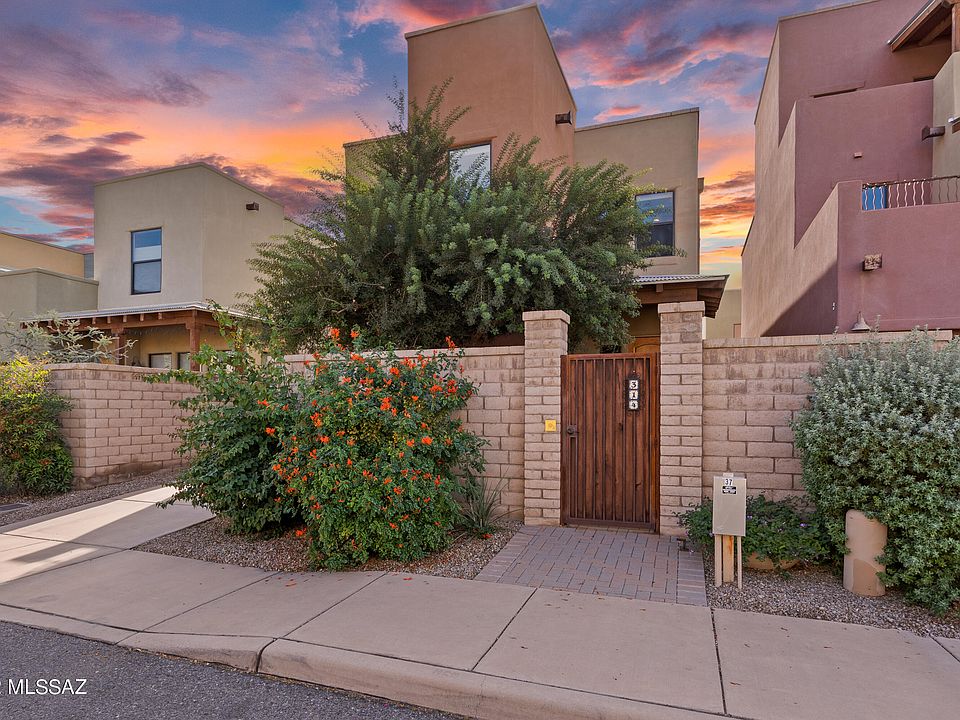 Welcome to barrio style living at gated Miramonte at the River! This immaculate contemporary home is privately tucked away towards the back of the community, with lovely courtyard entry that leads to inviting interiors. The kitchen opens to an ample living and dining area, complete with a large island, granite slab counters, upgraded cabinetry, stainless steel appliances, breakfast bar, and pantry. Laundry room and powder bath downstairs. Upstairs features primary bedroom with ensuite bath, custom tile, dual vanities with granite counters, and huge walk in closet! Third bedroom features a private balcony with generous mountain views. Additional loft space that would make a great den, and a private second bedroom. Pavered yard spaces add a warm component with the desert plantings. The HOA includes gate, pool/spa, maintenance of common areas including sidewalks, playground area, shaded dog park, streets, parking area. Convenient north/central location with direct Loop access! A great location to walk/bike ride to the farmer's market, Trader Joe's, St Philip's Plaza.