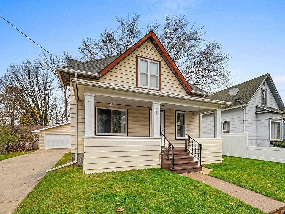 Convenient location, great curb appeal and an awesome extra large newer garage. Great fully fenced in back yard. Charming front porch. First floor offers the primary bedroom, spacious living room with a bay window and a good sized dining room. Upstairs find 3 bedrooms and a nice full bath. This is a great home to build equity by updating the flooring, fresh paint and the kitchen to your own taste. Updates per seller include central air (2024), water main from the house to curb and basement water pipes. Will not pass FHA financing or traditional conventional due to unfinished ceiling in the kitchen.
