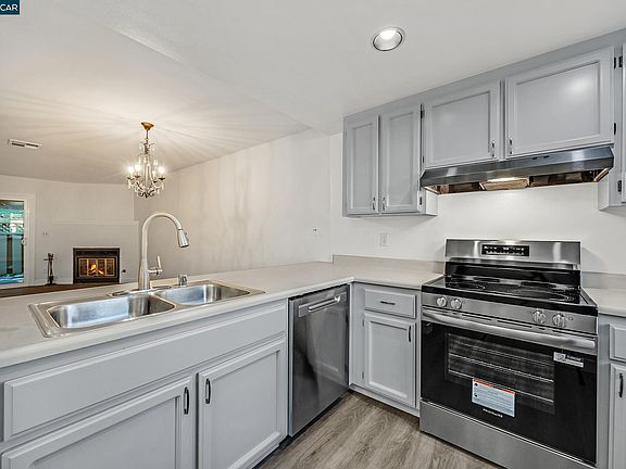 Welcome to this bright and inviting end-unit townhouse-style condo featuring fresh updates throughout. Enjoy the modern appeal of new stainless steel appliances, stylish flooring, and fresh interior paint. The open floor plan is enhanced by a gas-starting fireplace angled perfectly for multiple viewing areas, creating a warm and cheerful living space. This two-level design offers both comfort and privacy, with generously sized bedrooms, mirrored closet doors, and convenient inside laundry. Two decks provide the ideal spots to relax or unwind. The community offers a sparkling pool for leisure and entertaining. Complete with two covered carport spaces and an excellent commuter location with easy access to major highways. This home blends convenience, comfort, and charm.