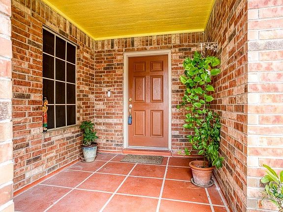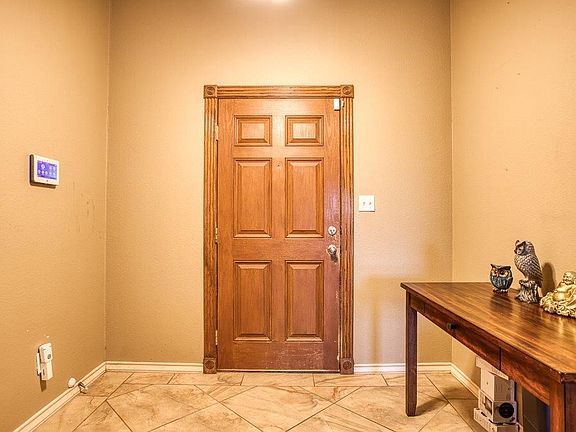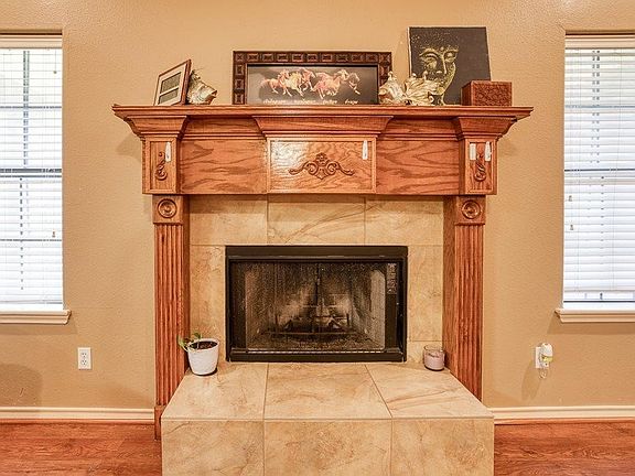 Wood burning fireplaceFruit treesSplit floor planDining areaGranite countertopsCeramic-tiled entrywayLush landscaping