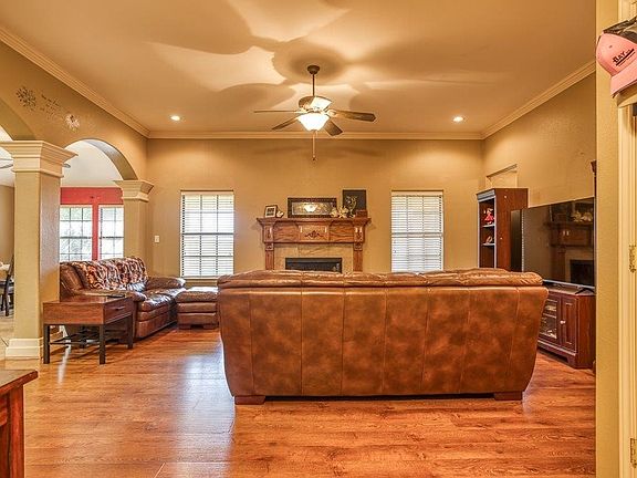 This well-maintained, beautifully landscaped brick home with a side garage sits on an elevated lot. It boasts a split floor plan with an open concept. The ceramic-tiled entryway, complete with a coat closet, leads to a welcoming living room with a wood burning fireplace that opens to the dining and kitchen areas. The kitchen features wood cabinets, granite countertops, and a breakfast bar that comfortably seats four. Stainless steel and black appliances include a stove/oven range, microwave, and dishwasher, along with a large pantry and an island for extra prep and storage space. The breakfast nook and dining area add plenty of room for entertaining. Separate laundry room located off the kitchen is spacious and offer cabinets for storage convenience. The spacious primary bedroom includes a bath with a whirlpool garden tub, separate shower, dual vanities, and a walk-in closet. Additional bedrooms are generously sized, and the main bath offers a tub/shower combination. The extended concrete open patio has plenty of room for entertaining backyard and is adorned with fruit trees and lush landscaping. The home also includes front and rear gutters, with a recently updated roof and HVAC system.