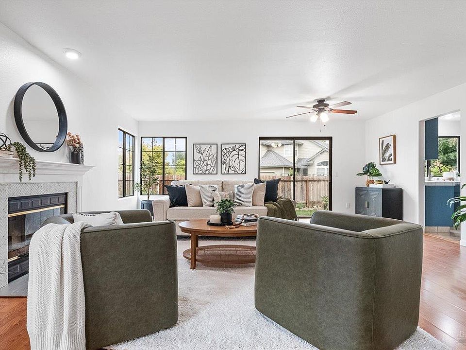 Cozy fireplacePrivate en-suite bathExpansive windowsFresh interior paintNatural lightPrimary suiteHard flooring