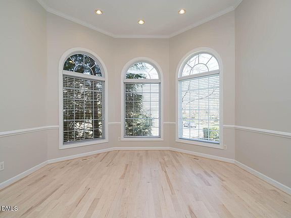 EAST FACING - 5BR/5BA plus a finished daylight walkout BASEMENT and GUEST room and FULL bathroom on the FIRST FLOOR! Gorgeous natural light streaming throughout with stunning sunsets from the back deck. MOVE IN READY - Newly painted, new carpet and refinished hardwood floors! Chef's kitchen with double ovens, endless counter space and multiple sinks! Intricate trey ceilings and extensive trim work found throughout. Upstairs, the spacious primary bedroom offers a peaceful, private view and includes a spacious en-suite bathroom and expansive walk-in closet. Three additional secondary bedrooms and a bonus room complete the second floor. Thoughtful and plentiful storage can be found throughout! The daylight walk-out basement is an entertainer's dream, featuring an oversized bonus/game room area, a custom-built wet bar with kegerator and fridge, an exercise room, and a full bathroom. The residence boasts state-of-the-art audio-visual systems, including a living room with a 5.1 surround sound, a pre-wired workout room for 7.2 surround sound, and a basement featuring a multi-zone audio system with 11 speakers across four zones, all wired back to the IT Closet. Additional features include a whole-house OTA antenna for reliable network TV and CAT5 connections to all TV locations, the bonus room, and the downstairs bedroom for exceptional internet reliability. Located on a coveted CUL-DE-SAC lot, you'll have walking access to the Cary Greenway, community walking trails, and Lake Crabtree. Enjoy living in a vibrant community with easy access to RTP/RDU, I-40, and I-540 - close to dining, shopping, and more! MUST SEE! Bring an offer!
