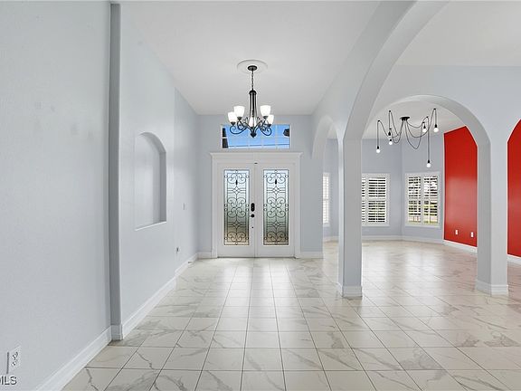 LAKEFRONT POOL HOME (NEVER FLOODED) behind the vibrant Cape Coral, Jim Jeffers park. this 4-bedroom, 3-bath home blends comfort with elegance. Sip your morning coffee on the lanai with the backdrop of your saltwater pool and tropical lake views. Perfect morning begins here! Natural sunlight warming the modern flooring, framed by plantation shutters and an open kitchen, equipped with granite counters, a spacious island, and a pantry, makes meal prep a breeze while friends chat nearby. Unwind in the master jetted bathtub or refresh in the separate shower, with dual sinks for ease. The 3-car garage offers plenty of storage, and the west-facing pool house sets the scene for relaxing evenings by the water while enjoying the sunset backdrop surrounded by nature. Nestled in a vibrant Cape Coral neighborhood with Jim Jeffers Park and Oasis Elementary N behind you, this home is perfect for a connected, sunny lifestyle. Don't miss out, tour this home today! Ask me more about the new developments nearby making this a HOT SPOT to live in Florida paradise!
