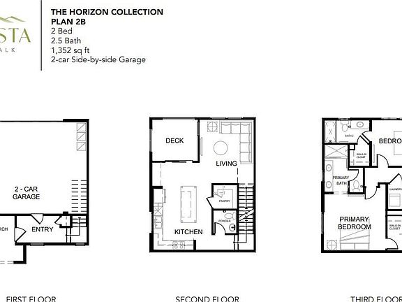 This floorplan offers 1,352 square feet of thoughtfully designed living space, with 2 bedrooms and 2.5 baths.  On the first level you'll enter through a large private patio, head into a covered porch, then find a nice entryway with coat closet and a large side-by-side two car garage.  The second floor is your main living level and features a spacious kitchen with large eat-in island, an open living room and an oversized outdoor deck. On the upper level you'll find a conveniently located laundry room, your large primary suite with walk-in closet and a secondary bedroom with private en-suite bath.