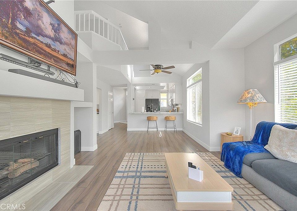 Step inside to an incredible open-concept design. The soaring ceilings above the living room create a dramatic effect as sunlight cascades through the expansive wall of windows. On a cool evening, enjoy the ambiance and warmth from the toasty fireplace, perfect for autumn nights. Beautiful tall baseboards add a gracious, finished touch throughout.