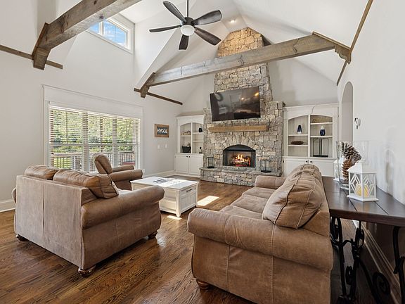 The heart of the home is the chef’s kitchen, anchored by a custom island with quartz countertops and a farmhouse sink. Additional granite counter space and a gas range make it a dream for cooking and entertaining. The living room invites you in with soaring vaulted ceilings, exposed solid wood beams, and a striking custom stone fireplace flanked by built-in shelving and cabinetry—perfect for cozy evenings or gatherings with friends. The primary suite is a true retreat, complete with his-and-hers closets and a spa-inspired ensuite featuring a dual vanity, soaker tub, and separate shower.