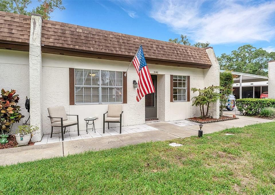 This END UNIT with 2 BEDROOMS, 2 FULL BATHS condo that includes a COVERED CARPORT with STORAGE LOCKER (large enough for bikes, kayak, or decorations) PLUS a FLORIDA ROOM that looks over Green Space that extends your living space beyond the 866 sq ft under air. The home features Light colored, wood-like Laminate flooring, AN INSIDE LAUNDRY CLOSET, plus a DISHWASHER and a BUILT-IN MICROWAVE in the kitchen. The kitchen with plenty of counter space and storage cabinets overlooks the Dining area and has a large window that brings in natural light. Updates also include a NEW ELECTRICAL PANEL in 2020, HVAC in 2019, New Ceiling Fans throughout, and it has been painted with pleasing, neutral colors that will go with any decor. Being Sold Furnished or Unfurnished. The Mission Grove Community has its own pool, shuffleboard, pool pavilion, and laundry facilities. The $674 monthly HOA fee covers the building insurance, the roof, cable, internet, water, sewer, trash, and ground maintenance, giving you the freedom to come and go as you please. The $164 monthly HOA fee gives you the "BIG CLUB" with GOLF with NO GREEN FEES on 3 executive courses, FREE Boat or RV Storage on a secured lot, 2 Heated POOLS, Ceramics, Stained glass, Woodworking workshops, Card games, Board Games, Shows, 2 PONTOON boats for cruising Lake Tarpon, just to name a few. Highland Lakes on Lake Tarpon, where Relaxation and Recreation come together in this "55 or better" community. Convenient to shopping, quaint downtown Palm Harbor, the Beaches: Honeymoon Island, Sunset Beach, Fred Howard and Clearwater Beach, 2 International Airports, the perfect place for the full-time resident or a seasonal home.