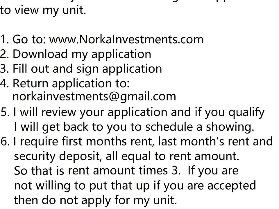 NOT SECTION 8 APPROVED Call or Email For Application: norkainvestments.com Ranch twinplex 2 bedrooms 1 bathroom eat in Kitchen with stove and refrigerator large livingroom 16' x 16' laundry room 1 car garage All ELECTRIC NO PETS! Application at NorkaInvestments.com