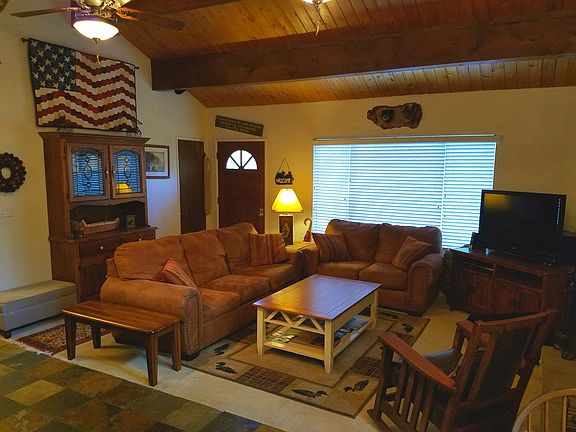 Escape to Your Own Mountain Sanctuary! Nestled in the scenic beauty of Running Springs, this charming home, available furnished or unfurnished, offers the perfect blend of tranquility and comfort, making it an ideal full-time rental for those seeking a peaceful, quiet lifestyle with ample parking on rare double lot and numerous amenities. Key Features: Spacious Living Areas: Enjoy an open-concept living and dining area with vaulted ceilings. Large windows fill the space with natural light and showcase breathtaking mountain views. Fully Equipped Kitchen: The fully equipped kitchen has stainless steel appliances, ample counter space, and plenty of storage for all your cooking essentials. Cozy Bedrooms: The home features two well-sized bedrooms. Outdoor Space: Step outside to your own private outdoor oasis, featuring a wrap around deck, children's playset, and 7 person Jacuzzi spa, ideal for entertaining, stargazing, or enjoying the fresh mountain air. Parking: With the entirety of an additional lot, you will not find a larger flat parking space, big enough for your RV, trucks and cars. Fireplace/Heating: Cozy up by the wood burning fireplace and central heating during cooler months. Private & Quiet Location: Located in a peaceful, secluded area, yet still within walking distance from grocery stores, restaurants, shops and even a gym for convenience. Enjoy the best of both worlds: nature's serenity and access to local amenities. Additional Details: Laundry area Full bathroom Fenced backyard Snow plow service included 7 miles to Snow Valley Ski Resort Rental Terms: Rent: $2000 per month, plus utilities Security Deposit: $2000 Lease Term: 12 months Pets: Contingent upon additional deposit Smoking: Non smoking home