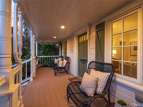 Discover a prestigious single-level home in San Juan Capistrano's historic Mission Flats, celebrated in architectural magazines and a highlight of the Mission San Juan Capistrano Garden Tour. Built in 1937 and fully renovated, this charming residence, just blocks from the iconic Mission and vibrant downtown, welcomes you with its quintessential front porch and unique Dutch doors. The formal living area is adorned with crown molding, a marble-faced gas fireplace, custom bookshelves, and hand-scraped hickory flooring, seamlessly connected to the bright dining area. The kitchen, an addition filled with natural light, features used brick paver flooring, custom cabinetry, granite countertops, a central island with a sink, a built-in desk, and a quaint breakfast nook, enhanced by wainscoting and beamed ceilings. A butler's pantry, incorporating a laundry area with a custom pull-down ironing board and attic access, adds to the home's functionality. The original bedroom, facing the front porch, captures the afternoon sunshine, while the full guest bathroom down the hall includes a soaking tub. The spacious master suite addition features a second marble-faced gas fireplace, French doors to the backyard, a bay window seat, and an en-suite bath with a walk-in shower, spa tub, and a Toto Neorest toilet. The property also boasts a small building known as the “Cozy,” ideal for various uses from a home office to a creative space. A driveway leads to a carport and a garage, each capable of housing two cars. The "Studio," attached to the garage, offers a perfect space for larger gatherings or a workspace, complete with a wet bar, ceiling fans, floor heating, and French doors to a large porch with outdoor heating. The secluded backyard, shaded by San Juan Capistrano's oldest oak tree and featuring a pond with a quiet waterfall, creates a serene haven. Enhanced by fire-resistant wood/cement composite exterior, heat-resistant artificial turf, Trex decking, an automatic irrigation system, an Insteon lighting system, and Sonos sound system throughout, this home marries classic elegance with hidden modern technology. Additional features include retractable screens at all French doors and an automatic awning, ensuring comfort and convenience in this home of historical significance and charm.