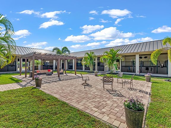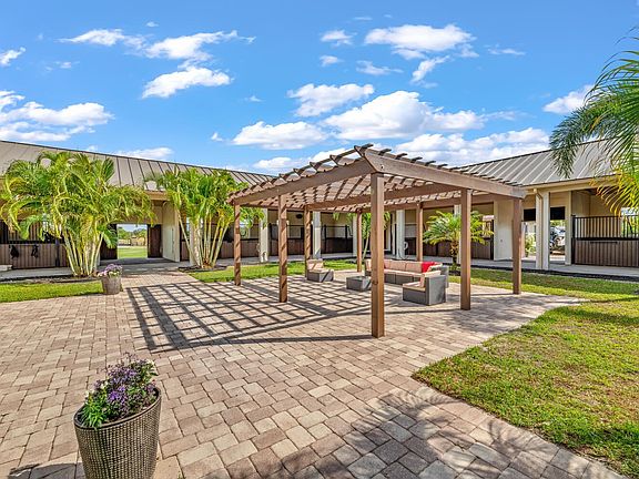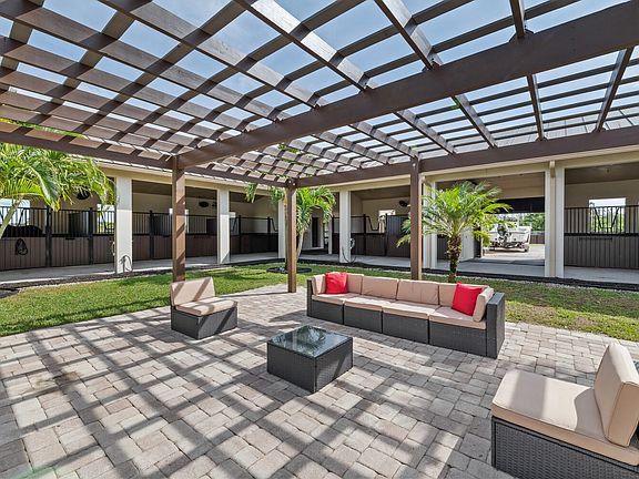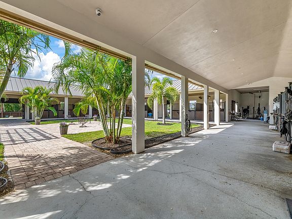 This 24-stall courtyard-style stable & training facility offers total flexibility of use. Situated on 14 acres, the stable's mirror image layout allows perfect privacy for your horses, separate from boarders. There are 2 tack & 2 feed rooms, 2 wash-rack areas, and 2 apartments, totaling 6Br. Horses relax in this Florida open-air design with tranquil views to the inner-patio sanctuary. There is a 4Br/2Bth apt. on the East end of the stable and a 2Br/2Bth apt. on the West end. Both have a primary bedroom w/ in suite bathrooms. Adjacent to the stable is the covered arena (199' x 67') with GGT footing & attached storage garage (61' x 31' totaling 1,891 sq. ft.), a 4-horse exercise walker & 12 grass paddocks. There is plenty of room for an outdoor arena & to build your custom estate home! 2023-08-31