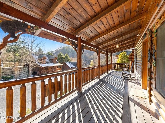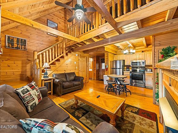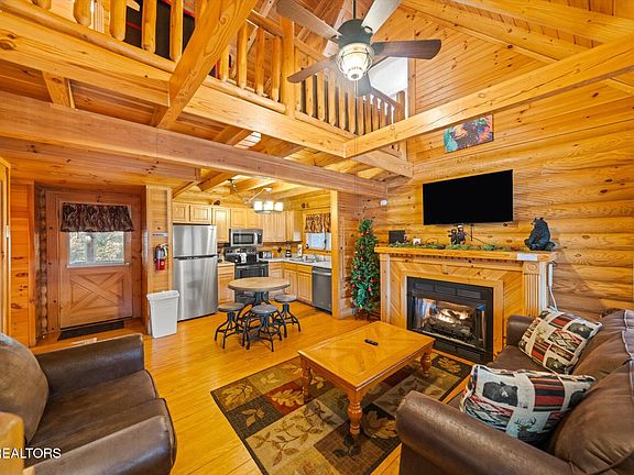 Wonderful 2 bedroom, 2 bath, log cabin, located just minutes from downtown Pigeon Forge, in Smoky Mountain Ridge Resort. The handcrafted, wood detailing around the front porch, windows and door are simply adorable and set the stage for an incredible Smoky Mountain getaway! Just under 1,000 sq.ft. of living space, spread out over 2 levels and featuring 3 sleeping areas. Its solid wood interior, soaring cathedral ceiling with exposed beams and log railings lend a rustic feel to a modern cabin. The open floor plan adds to the spaciousness of the main level. The full kitchen comes complete with stainless appliances and plenty of cabinet space. The cabin's living room features a cozy fireplace. The large, main level bedroom suite is complete with a full bathroom. On the upper level, you'll find the second bedroom, second bathroom and an open loft, complete with bunk beds, an arcade game and additional seating. Of course you'll want to spend time outdoors too and with covered decks on both the front and back, there's plenty of space at your disposal. As a bonus the back deck features an outdoor hot tub. Local rental management company projects $67K gross rental income. Roof replaced and cabin stained in 2023.