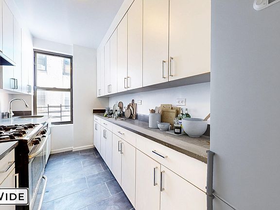 The extra-large living room offers plenty of space to set up a full lounge and dining area, with sunny windows overlooking the back of the building for peace and quiet. The separate galley kitchen features stainless steel appliances, great counter space, ample cabinetry, and a window for natural light and ventilation.