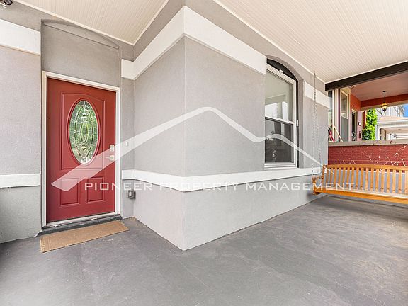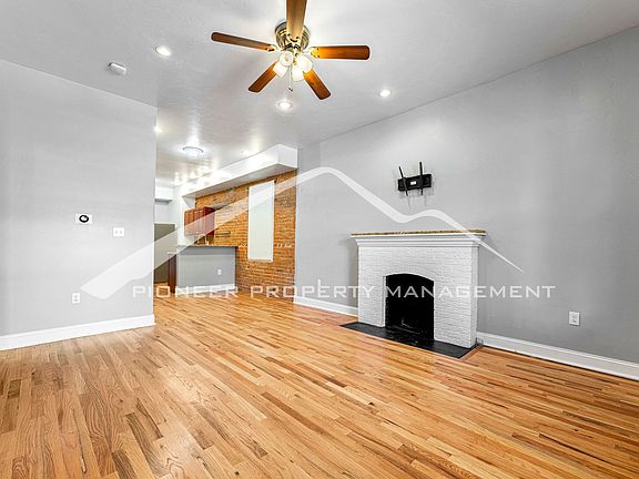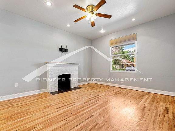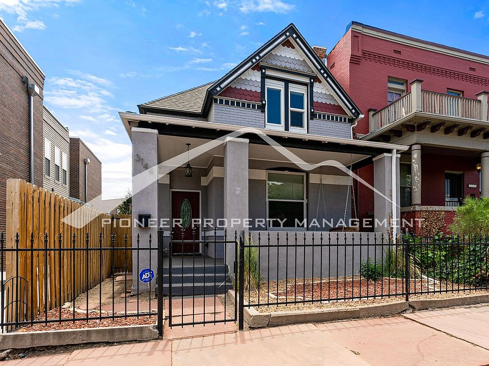 Welcome to this gorgeous 3 bedroom, 2 bathroom home located in Denver, CO. The property features a lovely front porch and a landscaped front yard surrounded by a fence. The living room is spacious, with an exposed brick accent wall. The fireplace in the living room is decorative. The kitchen features stainless steel appliances including a dishwasher, microwave, refrigerator, and a gas stovetop. Countertops are granite, and there is plenty of cabinet space for storage.