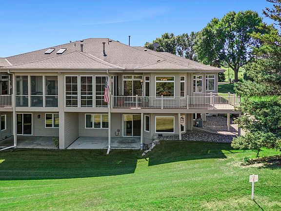 Luxury living in The Wilds! This 3BR/3BA end-unit townhome is perfectly positioned on the 6th hole of the golf course with sweeping views and natural beauty all around. Designed with open-concept, single-level living in mind, the main floor is filled with natural light and upscale finishes. The main level features hardwood floors, vaulted ceilings, and both living and family rooms that create plenty of space to gather or relax. A bright kitchen stands out with white cabinetry, granite counters, stainless appliances, and striking blue accents in the island and backsplash. Enjoy meals in the formal dining area, casual breakfast nook surrounded by windows, or out on the maintenance-free deck just off the 4-season porch. The main-level primary suite feels like a private retreat, complete with a walk-in closet with built-in organization and an ensuite bath with a soaking tub and tiled walk-in shower. Main-level laundry and mudroom add extra convenience. The walkout lower level offers even more living space with a cozy family room centered around a gas fireplace and built-ins, two additional bedrooms (perfect for guests, office, or flex space), a full bath, and a large storage room. The garage is upgraded with epoxy floors for a clean, polished look. Set in a premier community, this home offers natural beauty, golf course views, and easy access to Prior Lake’s lakes, shopping, dining, and recreation. A perfect blend of luxury, function, and location—this is The Wilds lifestyle at its best!