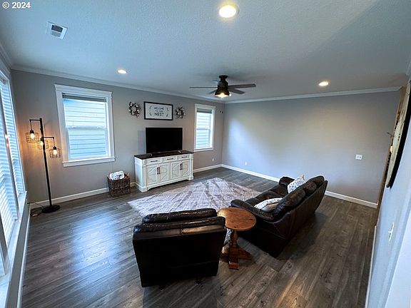 Enjoy breathtaking views of the tip of Mt. Hood from your porch and living room in this exquisite single-level home. Featuring 3 bedrooms and 2 bathrooms, this residence offers a perfect blend of comfort and style.Interior Highlights:Spacious kitchen with Quartz countertops, laminate flooring, and a gas Appliances Walk-in pantry for ample storage.Primary bathroom includes double sinks, a separate shower, and a soaker tub.Family room and dining room both open to a covered back patio, perfect for entertaining.Exterior Features:Fully fenced backyard complete with a trampoline and play structure, which will stay with the home.Covered back patio has a Gorgeous Wood ceiling with Fans , accessible with French Door from multiple rooms, providing a great space for outdoor relaxation.Don't miss the opportunity to make this beautiful home yours. Call today to schedule your private tour!