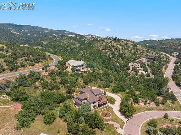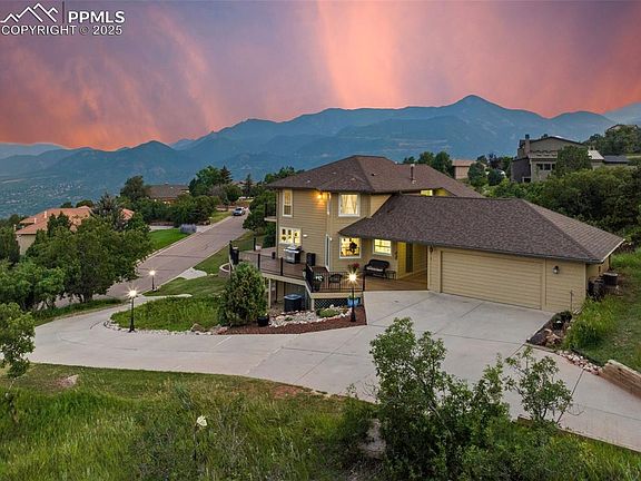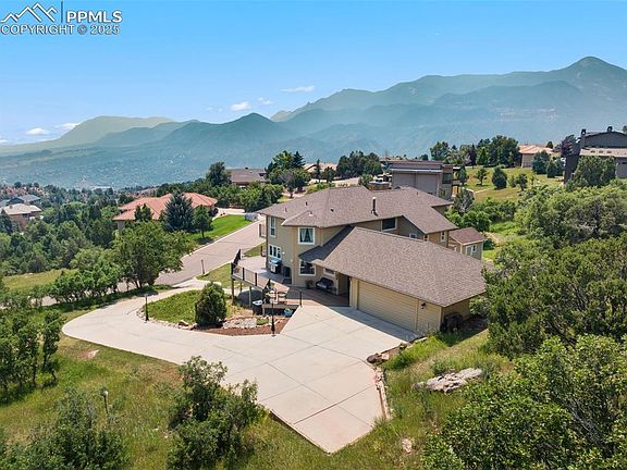 ENDLESS VIEWS! Stunning Colorado vistas of the city and Front Range mountains await from this beautifully renovated home in the gated Cedar Height community—where you’re “Minutes Away, Worlds Apart.” This 5-bedroom, 4-bath residence has been updated with new windows, composite decks, water heater, furnace, whole-house A/C, and a fully upgraded kitchen featuring new cabinets and quartz countertops. Newer roof and exterior paint in 2019 as well! Nestled on nearly an acre of low-maintenance, natural land, this graceful home offers tranquility, 24/7 security, and the pleasure of mountain living. Step into a secluded courtyard with a bubbling fountain, then enter an inviting foyer leading to a large sunken living room with a beamed ceiling, gas stone fireplace, and a window wall capturing breathtaking city and mountain views. The spacious kitchen impresses with sleek cabinetry, quartz counters, a large peninsula, walk-in pantry, laundry room access, and a wrap-around deck. The main level also includes a formal dining room, powder room, and a bedroom with a walk-in closet and adjacent full bath. Upstairs, is an additional bedroom with a walk-in closet and stunning views, a catwalk balcony overlooking the living room, and a luxurious primary bedroom suite, which includes a private deck, a 5-piece bath with an open shower and beautiful tub, and a spacious walk-in closet. Watch the twinkling lights of the city as you drift off to sleep. The walk-out ground level features a full guest suite with two large bedrooms, a bathroom, a kitchen with a breakfast bar, plus an additional dining area and family room with fireplace. A 2-car garage is connected to the home by a covered breezeway. This exceptional home, located in one of Colorado Springs' most desirable neighborhoods, is a true gem with countless upgrades and unparalleled charm.
