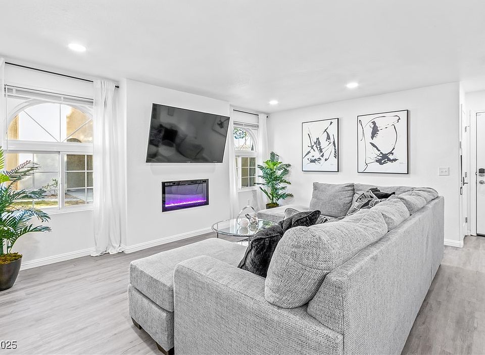This beautifully designed 2-bedroom, 2-bath condo offers comfort, convenience, and style—all just minutes from the Las Vegas Strip, shopping, and easy freeway access. The upgraded kitchen features quartz countertops, a breakfast bar, stainless steel appliances, and elegant pendant lighting. The spacious living area is highlighted by a cozy fireplace and luxury vinyl flooring for easy maintenance and a modern touch. Just off the dining area, the private patio provides a perfect spot to relax or enjoy your morning coffee. Additional features include upgraded bathrooms with granite, ceiling fans throughout, and an in-unit laundry room for added convenience. The community offers a sparkling pool, relaxing spa, fitness center, BBQ area and ample guest parking. HOA fees cover water and trash services, making budgeting simple.