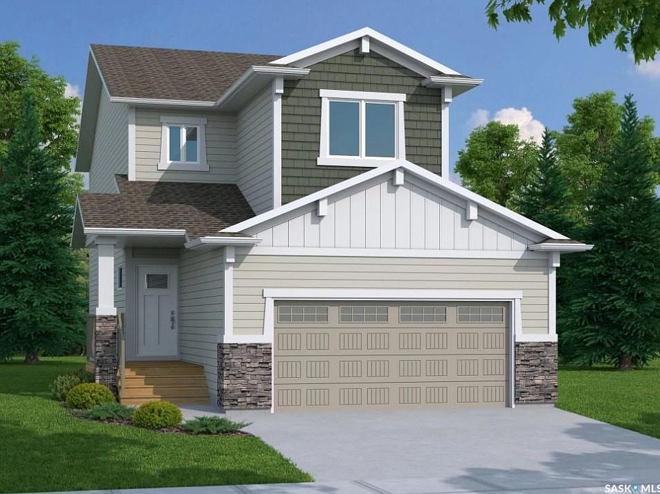 UNDER CONSTRUCTION. Welcome to "The Richmond" by premier builder Ehrenburg Homes, located in the vibrant Eastbrook community. This beautifully designed two-storey offers 1,560 sq. ft. of functional living space with premium finishes throughout. The main floor welcomes you with a bright, open-concept design—perfect for family living and entertaining. The spacious living room features a striking stack stone feature wall and an elegant electric fireplace, while large windows fill the space with natural light. The contemporary kitchen is the heart of the home, complete with quartz countertops, a large island with eating bar, and modern cabinetry. The adjoining dining room is ideal for gatherings, and a convenient 2-piece bath rounds off the main level. Upstairs, you’ll find three generous bedrooms. The primary suite boasts a walk-in closet and private 3-piece ensuite with dual sinks. Two additional bedrooms, a full bath, and a dedicated laundry room provide comfort and practicality for busy households. A versatile bonus room adds even more living space—perfect as a family lounge, playroom, or home office. The basement is open and ready for your future development, whether you envision a rec room, gym, or guest suite. Outside, front landscaping, underground sprinklers, a front sidewalk, and a double attached garage. With Saskatchewan New Home Warranty protection and Ehrenburg’s superior craftsmanship, The Richmond is the perfect blend of style, space, and peace of mind. (PST/GST are included within purchase price). NOTE: Interior photos are from a previous build. Same model but some colours may vary.