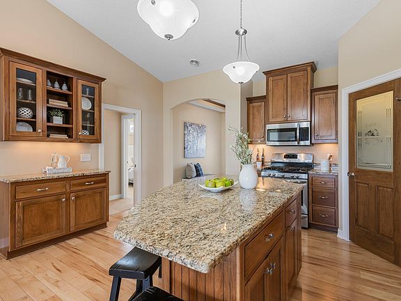 Located in a serene cul-de-sac in Blaine, this charming 2-bedroom, 2-bathroom home offers the perfect blend of comfort and convenience—perfect for those seeking the ease of single-level living. Enjoy easy access to Sunrise Lake, several scenic ponds, numerous parks, walking paths, and a variety of dining and shopping options—all just minutes away. Step inside to a welcoming foyer adorned with elegant crown molding. Just off the entryway, you'll find a well-appointed mudroom featuring a hall closet, wall hooks, and a built-in bench for everyday convenience. A built-in desk area adds the perfect touch for a home office or additional storage needs. The open-concept floorplan creates a spacious and airy feel, with the heart of the home being the gourmet kitchen. This beautifully designed space features stainless steel appliances, granite countertops, rich wood cabinetry, a large center island with pull-out drawers, under-cabinet lighting, and a walk-in 4x4 pantry. Adjacent to the kitchen, the dining area boasts soaring 13-foot vaulted ceilings, a stylish chandelier, and a sliding glass door that leads to the 19x18 cement backyard patio—ideal for indoor-outdoor entertaining. The living room is warm and inviting, complete with a ceiling fan, plush carpeting, a large picture window with backyard views, and a cozy gas fireplace with a stone surround and a classic mantel. Retreat to the spacious primary suite, featuring soft carpeting, a ceiling fan, and windows that allow natural light to fill the space. A generous 10x6 walk-in closet with built-in shelving provides ample storage, while the private en suite bathroom offers a double vanity, tile flooring, and a soaking tub/shower combo with a beautiful tile surround. The second bedroom also features plush carpeting, peaceful views of the front yard, and a large closet with wire shelving. The second full bathroom includes tile flooring, a combination tub/shower with tile surround, and a sizable linen cabinet. A nearby designated laundry room adds extra function, with a utility sink and built-in cabinetry. A true standout feature of this property is the oversized, heated 3-car garage, designed with both functionality and flexibility in mind. It offers 15-foot ceilings, built-in cabinetry, and three separate doors, each equipped with remote openers. One of the stalls is an extra-deep 27 feet—ideal for larger vehicles or expanded storage needs. Everything in the garage is included in the sale including a car lift (with reinforced concrete—an additional 6 inches beneath for enhanced stability), toolbox, cabinetry, and storage bin. The lift accommodates storage for two vehicles, making it perfect for car enthusiasts or those needing extra space. Above the garage, you'll find a finished and carpeted storage area, adding even more usable square footage. Additionally, a natural gas generator provides reliable backup power for peace of mind. Outside, enjoy a low-maintenance lifestyle with an in-ground irrigation system and plenty of space for outdoor relaxation or entertaining.