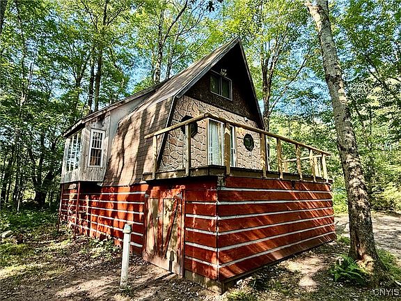 Escape to the woods! Located on 4 beautifully wooded acres, this is the perfect year-round get-away style "camp"! Whether it's snowmobiling the Tug Hill Plateau or riding the side-by-side to the Salmon River for fishing, this location is perfect for it all- even with trails on your own property! And it's just a stone's throw from the North Osceola Line Brook State Forest, too. Inside is a cozy living room with a wood stove and good storage at the entry. A few steps up and you're in the kitchen with small island, all appliances, and a cute little dining area in front of the windows. Off the kitchen is a bid deck overlooking the yard- perfect for a grilling and lounging. Back inside there's a full bath on that floor and there's even a laundry nook! Upstairs on one side has a sleeping loft and the other side has a pull-down stair option for another bedroom option or great storage. There's a small basement area with e workbench and good access to the utilities and the foundation. It's currently supplied by a spring fed tiled well, but there is a drilled well on the property. The seasonal road is plowed (past the cabin) and accessible in winter. If you're looking for a truly unique get-away with some of the best outdoor recreation Central New York has to offer, this home just might be it!