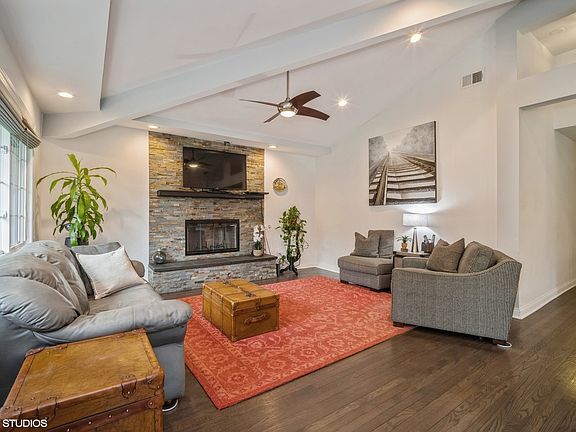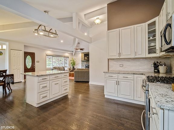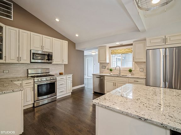 2016 Interior and exterior fully gutted including new roof, windows, HVAC and mechanicals.Neutral colors throughout with updated kitchen and bathrooms.Hardwood floors in each room. 2016 Kitchen rehab includes designer cabinetry, SS appliances & large island-great for entertaining since it is open to the dining/living room. Primary bedroom with double vanity bathroom and luxurious larger shower and walk-in closet. The living/dining/kitchen areas have architectural vaulted cathedral ceiling, gives the main living space an open, bright and large feel. The backyard is professionally landscaped, with a recent deck addition, and privacy fence. Quiet neighborhood within the heart of Glenview, award-winning school Districts, 34 and 225. Right next to the elementary school, walking path that takes you directly to the Glen, walking distance to Flick park, golfing, shopping, restaurants, and the Kohl's Children's museum.