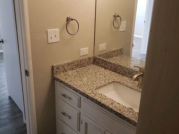 Granite countertopsStainless steel appliancesWood plank vinylNice fixtures