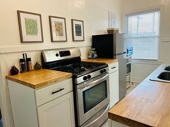 Complete with split system refrigerated air conditioning/high efficiency heater, new refrigerator, washer/dryer, butcher block countertops and gas stove, custom made doors with convenient coded locks, and new high-efficiency windows throughout. Second story space with views of downtown neighborhood throughout the unit. Lovely and secured shared backyard space with room to garden or relax. A lovely, clean, and comfortable space with a community feel.
