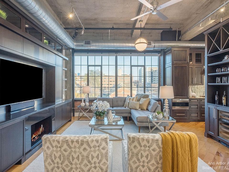 Exquisite, sophisticated and breathtaking are the first words that come to mind when describing this luxurious & profoundly rare corner penthouse unit located at the coveted Liberty Lofts development in the heart of downtown Ann Arbor! There simply isn't another condo like this in the city. Upon entry, you'll be greeted by an expansive living room w/soaring ceilings & floor to ceiling windows overlooking the city skyline, including Michigan Stadium! The chef in the family will absolutely fall in love with the professional grade gourmet kitchen w/granite countertops, and only the finest appliances including Wolf & Subzero. The main floor master suite will impress the most prudent of buyers as will the updated custom master bathroom suite. This completely remodeled 2 bedroom, 2.5 bathroom co condo features a Lutron lighting system, custom light filtering shades throughout, refinished cherry floors, high end entertainment equipment and tailormade black walnut built-ins throughout. The discerning buyer will appreciate the spiral staircase leading to the 2nd bedroom/office. Perhaps the best kept secret is your own private rooftop deck overlooking the city. Bring your favorite wine and enjoy city living. 2 parking spaces, Primary Bath