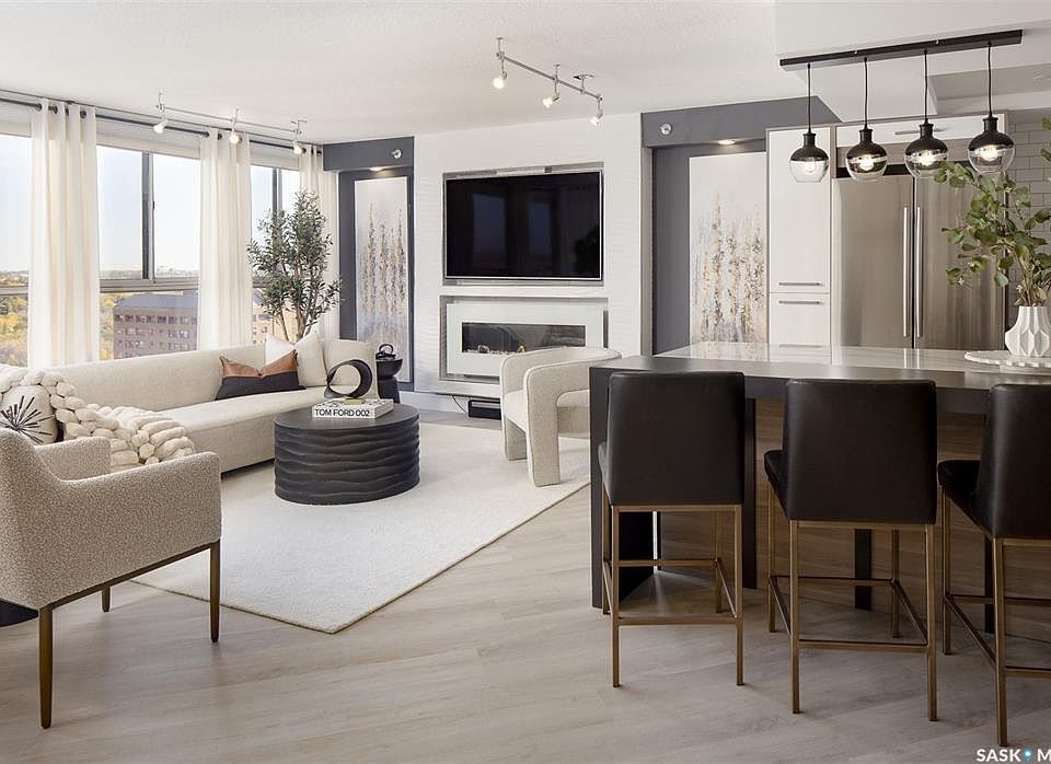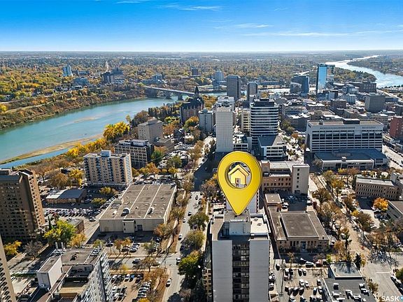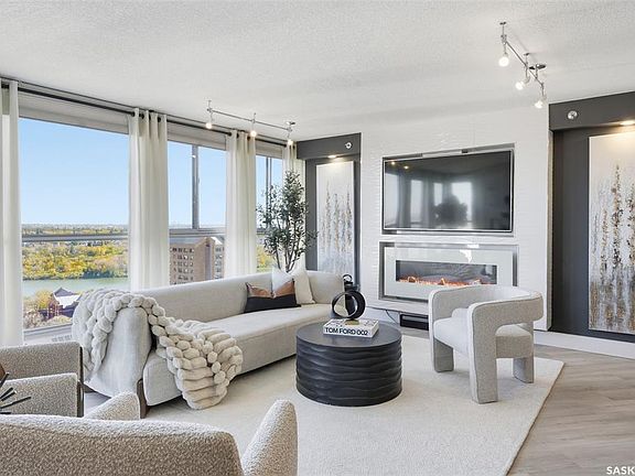 Experience Downtown Saskatoon Penthouse Living with an amazing View of the River! Indulge your desire for high-end, maintenance-free living with this breathtaking 1,528 sqft Penthouse Condominium in the vibrant core of Saskatoon. Far more than a home, this is a lifestyle defined by convenience and sophistication, boasting an enviable Walk Score of 96 and a Bike Score of 99. This professionally renovated sanctuary is a testament to modern design. The stunning kitchen is a chef's dream, featuring upgraded appliances, sleek quartz countertops, and a generous island with a sit-up bar that flows seamlessly into the main living space. The entire unit has been elevated with modern flooring, designer paint tones, and updated light fixtures, culminating in the removal & replacement of the dated ceiling for a smooth, contemporary finish. Designer touches by Fresco Interiors, including but not limited to custom drapery, add a final touch of tailored elegance. Upgraded blinds throughout give you privacy when you want it most. Step outside and immerse yourself in the city's best. You are mere steps from the 60 km of trails in the serene Meewasin Valley. Enjoy cultural gems like the Remai Modern, Persephone Theatre, and the charming seasonal Shakespeare on the Saskatchewan. Every amenity—from fine dining and popular taverns to museums and nature parks—is just a short, pleasant stroll away. The Terrace amenities redefine community living, offering a large facility with a swimming pool, hot tub, sauna, an adjacent indoor lounge, and an expansive outdoor patio with community barbecues. For an even more spectacular experience, retreat to the rooftop patio for breathtaking, panoramic city views. Your exclusive, heated covered parking spot means you can safely forget about your vehicle and embrace urban life. Don't just move... move up! Call today for a private viewing of this affordable, classy, and perfectly located penthouse on Fifth Avenue.
