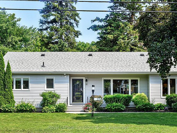 Collingwood - Coveted "Tree Street" home, nestled on a spacious full in-town lot. Featuring 3 bedrooms and 2 full bathrooms, the property boasts renovated bathrooms, with in-floor heating in the main bath and offers main floor living for your convenience. The bright, open-concept kitchen, dining, and living area is enhanced by quartz countertops. Enjoy cozy evenings by the gas fireplace or unwind in the separate, large family room. Ample parking options with a carport and a double-wide driveway, accommodating up to 6 vehicles. Outside, enjoy a workshop, garden shed and beautifully landscaped surroundings with an automated irrigation system. Not part of the NVCA restricted area. Additional perks include a newer washer and dryer and plenty of storage space. Walk to downtown, schools and close to all the area's amenities.