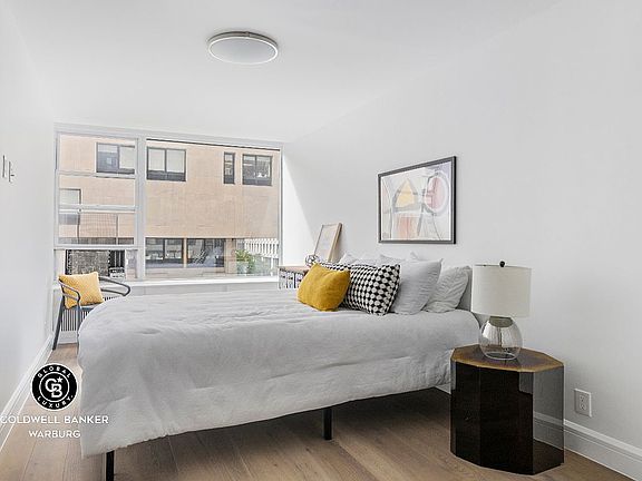 The king-sized bedroom is bright and spacious, with a large closet. The newly renovated bathroom features porcelain tile and a sleek, glass-enclosed shower with modern fixtures. Incredible storage, a brand-new Bosch washer and dryer, and new hardwood floors throughout complete this stunning Chelsea loft.
